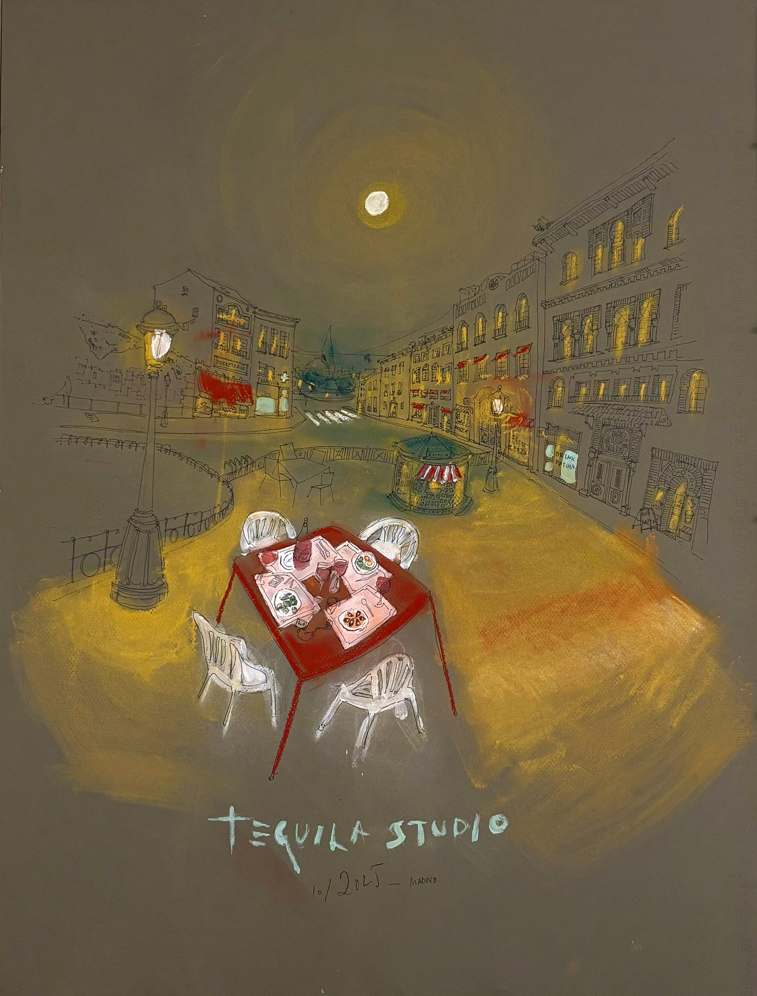 In El milagro de encontrar mesa, a very familiar situation is interpreted — any Saturday for someone living in Chamberí. After seven full laps around Plaza de Olavide, a free table finally appears, as if it had been there all along, quietly waiting for you. The scene borders on the absurd: the moment feels almost divine, the table seemingly lit by a celestial beam.